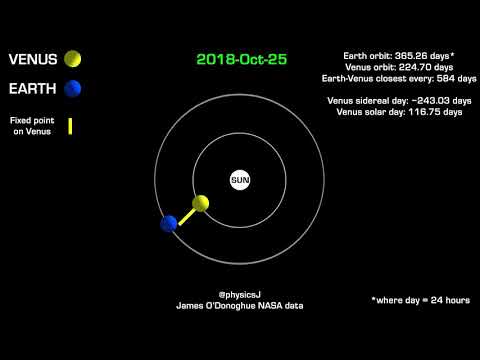 Explanation: Every time Venus passes the Earth, it shows the same face. This remarkable fact has been known for only about 50 years, ever since radio telescopes have been able to peer beneath Venus' thick clouds and track its slowly rotating surface. This inferior conjunction -- when Venus and Earth are the closest -- occurs today. The featured animation shows the positions of the Sun, Venus and Earth between 2010-2023 based on NASA-downloaded data, while a mock yellow 'arm' has been fixed to the ground on Venus to indicate rotation. The reason for this unusual 1.6-year resonance is the gravitational influence that Earth has on Venus, which surprisingly dominates the Sun's tidal effect. If Venus could be seen through the Sun's glare today, it would show just a very slight sliver of a crescent. Although previously visible in the evening sky, starting tomorrow, Venus will appear in the morning sky -- on the other side of the Sun as viewed from Earth.