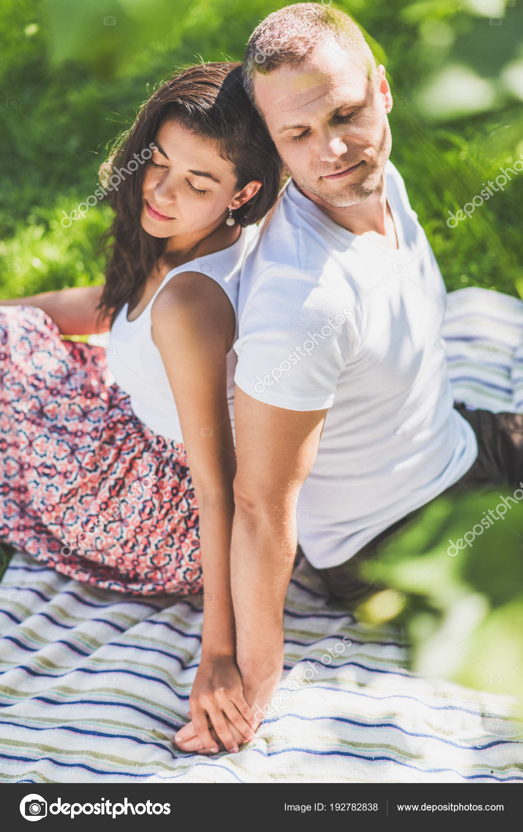 Close Up Portrait Of Beautiful Couple In Love Sitting On A Picnic Blanket Outdoor. Happy Dreamy Man And Smiling Brunette Woman Stock Image - Image of married, blanket: 140553093